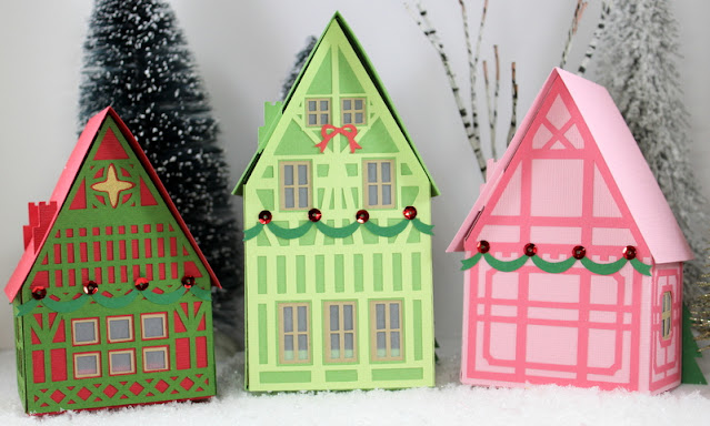 I cut them in a festive color theme and decorated them with bits and pieces from several other Lori Whitlock files. I used the swag and trees from Christmas House Card (Lori's Store, Silhouette Store) and the wreath and red bow from the Gingerbread House Treat box (Lori's Store, Silhouette Store).(I resized the decorations to fit the Tudor houses)